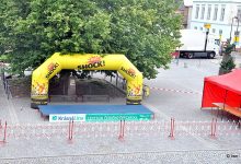 Vlastně ještě pár minut před startem to na náměstí vypadalo, jako že nic. Pusto, prázdno, holé pódium, ani lidi, ani auta, ani kola… Najednou jak mávnutím kouzelného proutku všechno jinak. Představování závodnic, s některými vybranými pár slov, všude horečnaté přípravy, mezi auty a stany se proplétají zvědavci, shromažďující se na start. Kamery, foťáky, mobily. Závodnice se staví pod bránu, vyčkávají, vyčkávají, každý se snaží zaujmout co nejlepší stanoviště, aby něco viděl. A najednou píšťalka, starosta Krásné Lípy Jan Kolář mávne praporkem tak rychle, že nemám na fotce ani šmouhu a frnk frnk, pestrobarevný peleton je za zatáčkou. A je to jak v životě – po velkých přípravách a chvilkové slávě za pár minut už ani pes neštěkne, že tu něco bylo. Náměstí je zase prázdné, lidé se vypařili a náhodní příchozí netuší, že se tu ještě před chvílí ani nedalo projít…