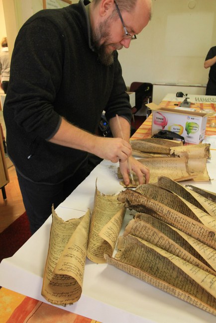 Ředitel Státního okresního archivu v Děčíně Mgr. Jan Němec prohlíží 2. 11. 2017 pamětní záznam kronikáře Josefa Denka z 10. 8. 1901.