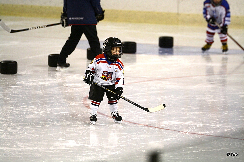 Lední plocha zaplněna, různá stanoviště, drobotina od té, co zjevně stála na bruslích prvně v životě, po takřka profesionální krasobruslaře…