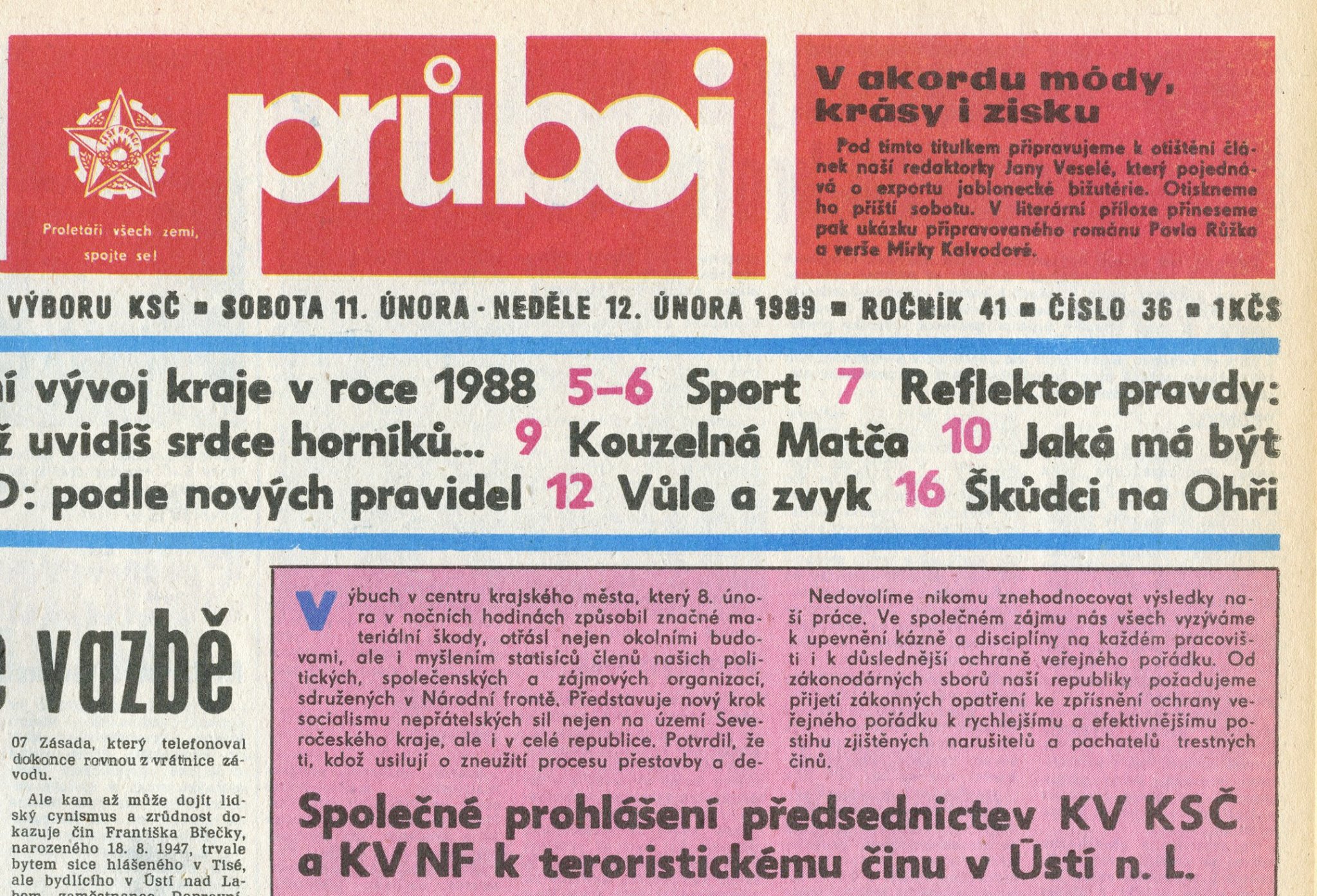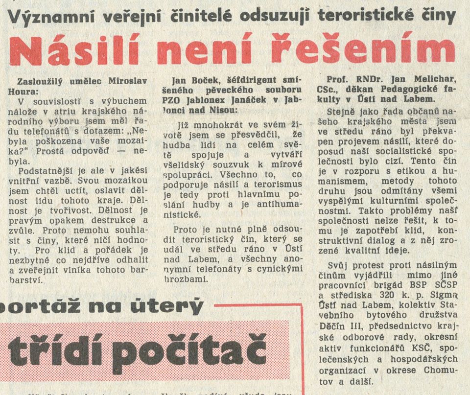 Výbuchy kolem sídel budov KSČ a národních výborů nebyly ve druhé polovině osmdesátých let časté ničím novým. V letech 1986-1989 došlo ke čtyřem takovým akcím – v Českých Budějovicích, Plzni, Pelhřimově a nakonec v Ústí nad Labem.