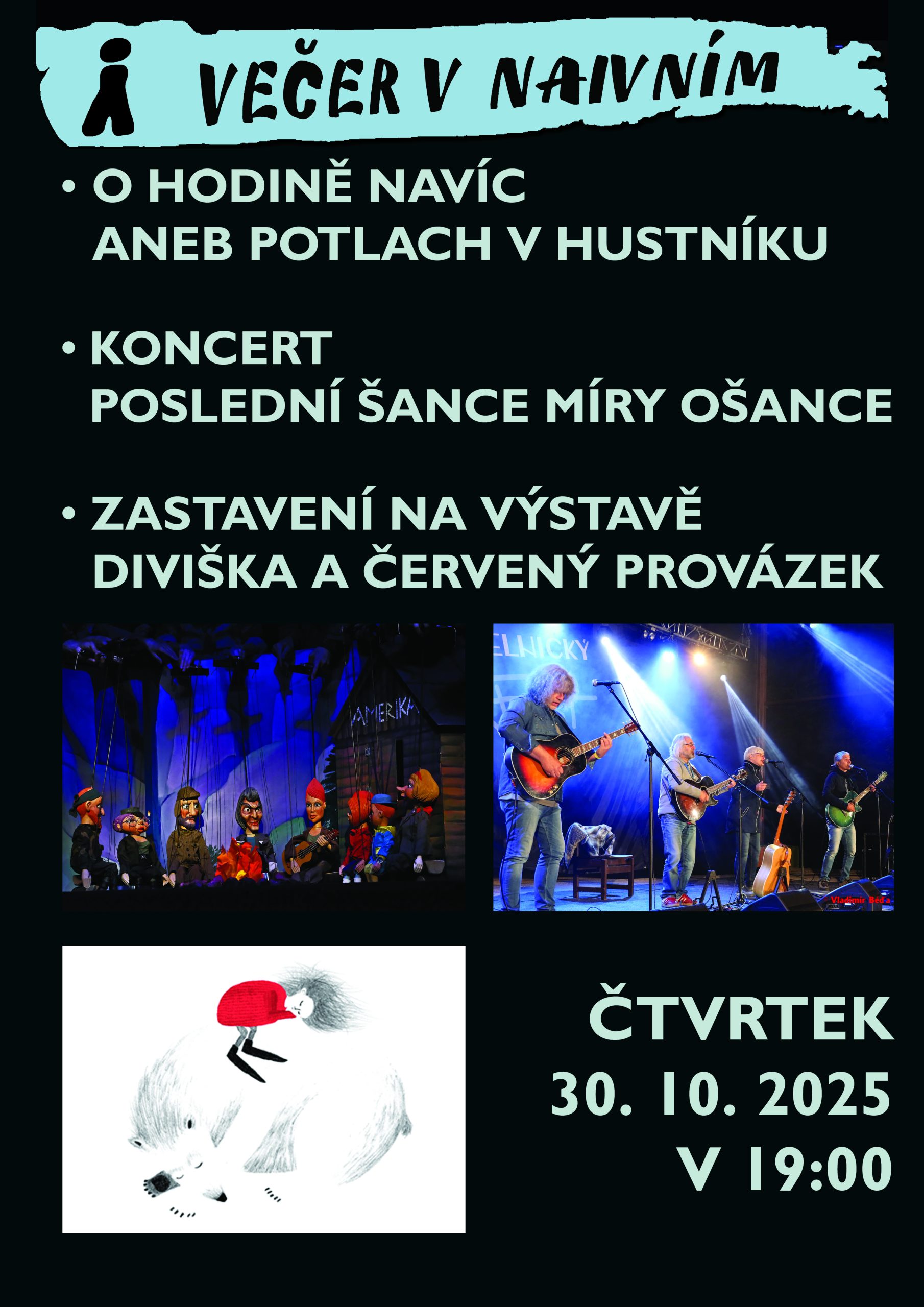 Ve čtvrtek 30. října v 19:00 hodin si Naivní divadlo Liberec připomene podzimní změnu času, a to loutkovou komedií O hodině navíc aneb Potlach v hustníku, jejíž děj se odehrává právě v onu magickou noc, kdy se ručičky hodinek posouvají o hodinu zpět. Po představení jsou diváci zváni do divadelního baru, kde se uskuteční Zastavení na výstavě ilustrací Venduly Tomšů z knihy Diviška a červený provázek, kterou napsala herečka Naivního divadla – Bára Purmová. Na malou vernisáž naváže koncert folkrockové kapely, nesoucí jméno člena souboru a korepetitora NDL – Poslední šance Míry Ošance.