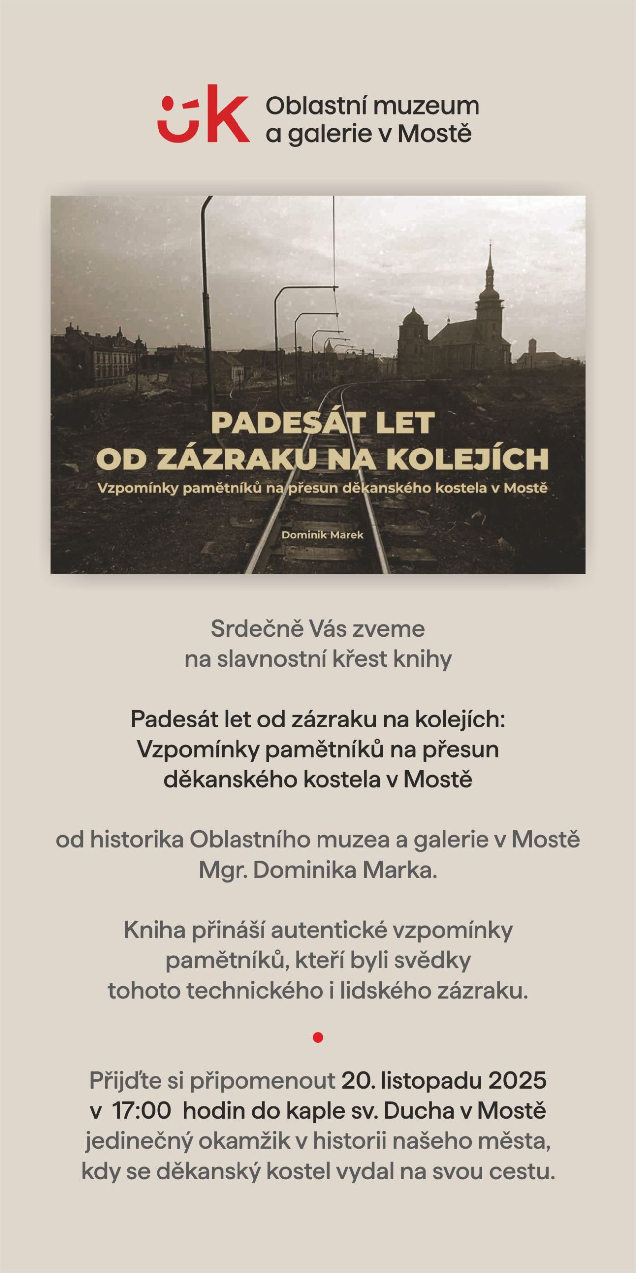 Slavnostní křest knihy proběhne 20. listopadu 2025 od 17:00 v kapli sv. Ducha v Mostě. Srdečně zveme veřejnost, pamětníky i všechny zájemce o historii města a jeho kulturní dědictví.