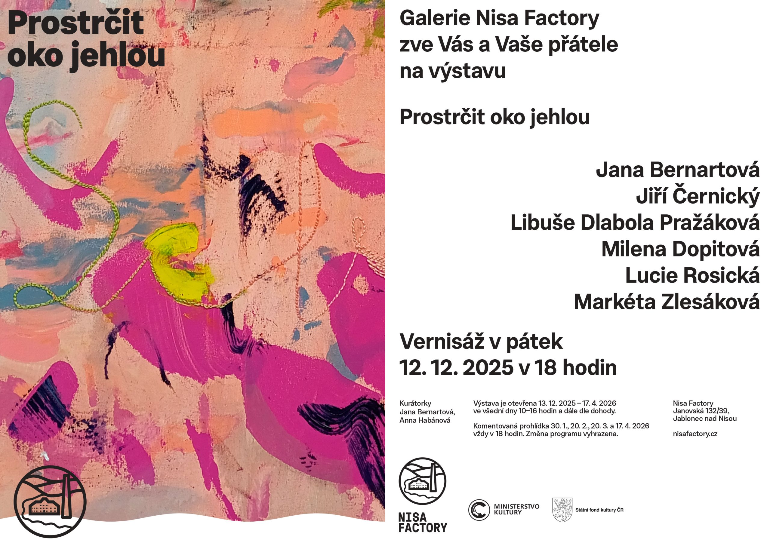 Galerie Nisa Factory otevírá novou výstavu s názvem Prostrčit oko jehlou, která představuje současné umění inspirující se textilem, jeho strukturou, ornamentikou i tradičními technikami. Název provokuje, téma však přímo odkazuje na historii samotné budovy – bývalé přádelny fungující od 19. století až do počátku 50. let 20. století.