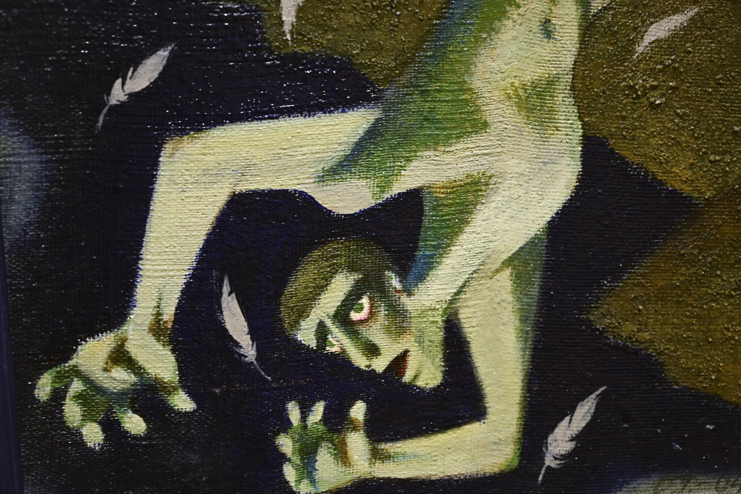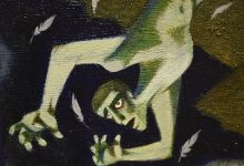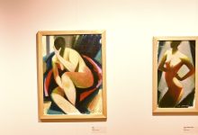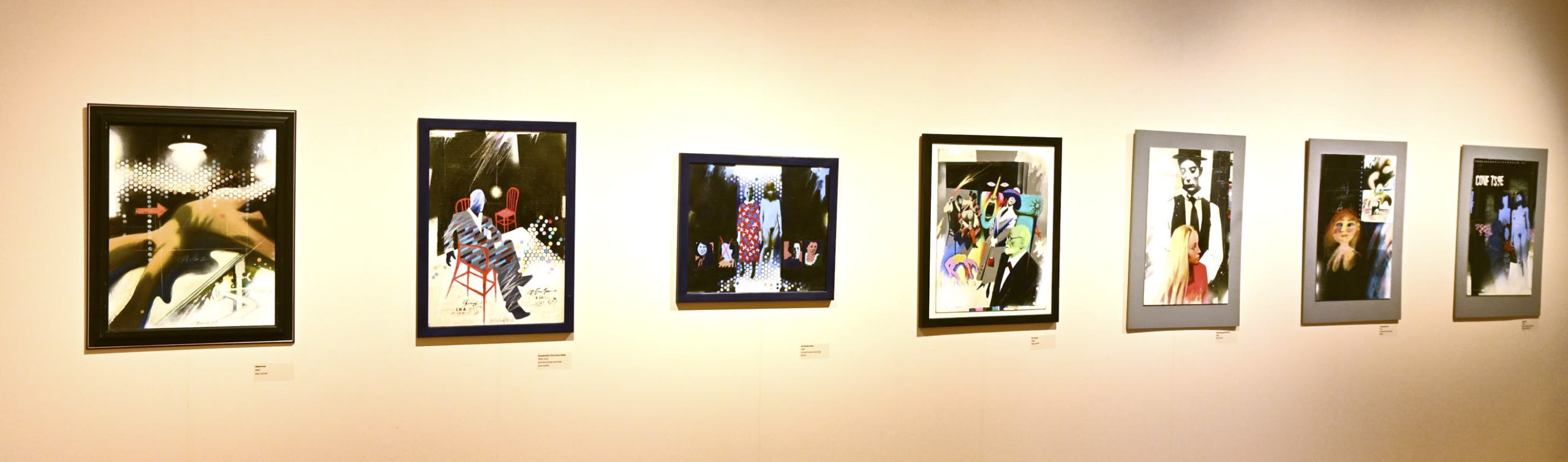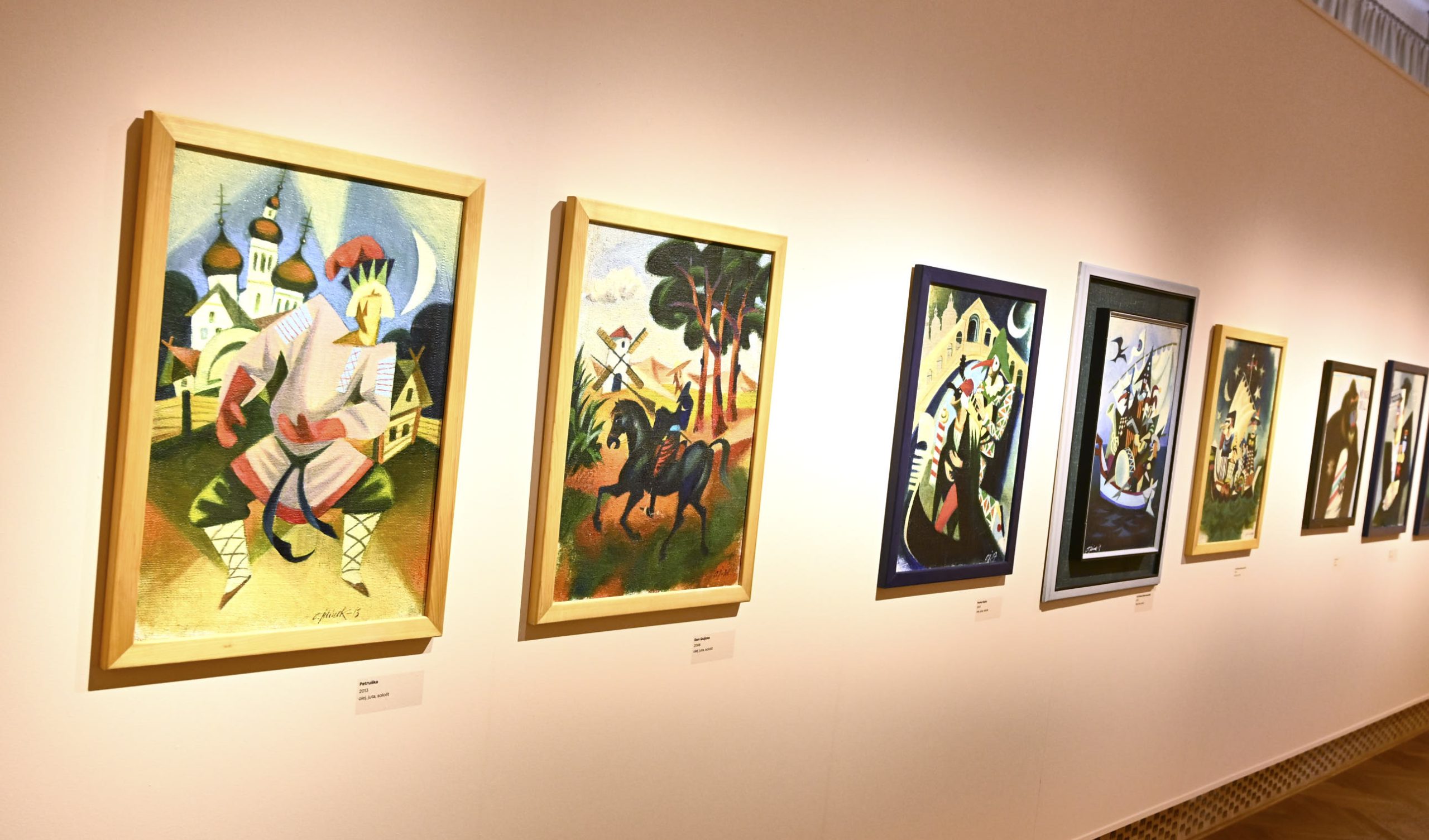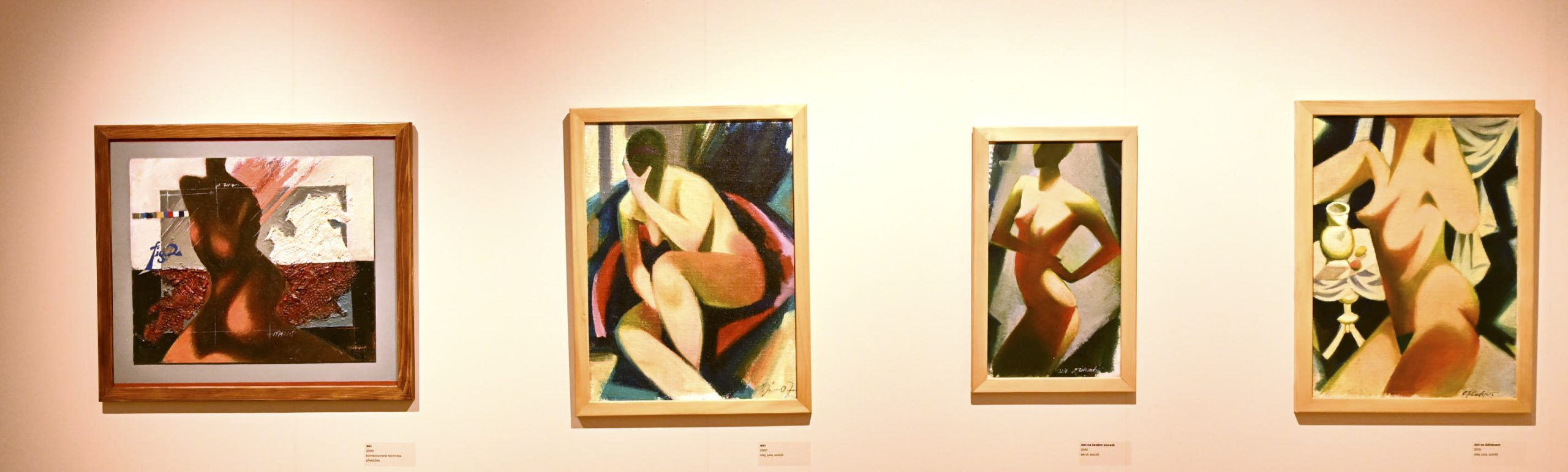 Na mostecké výstavě uvidíme hlavně malby. Jsou suverénní. Většina se vyznačuje hravostí a výraznou barevností, několik kousků je ale o poznání temnějších a barevná škála je spíš černošedá než jakákoli jiná.
