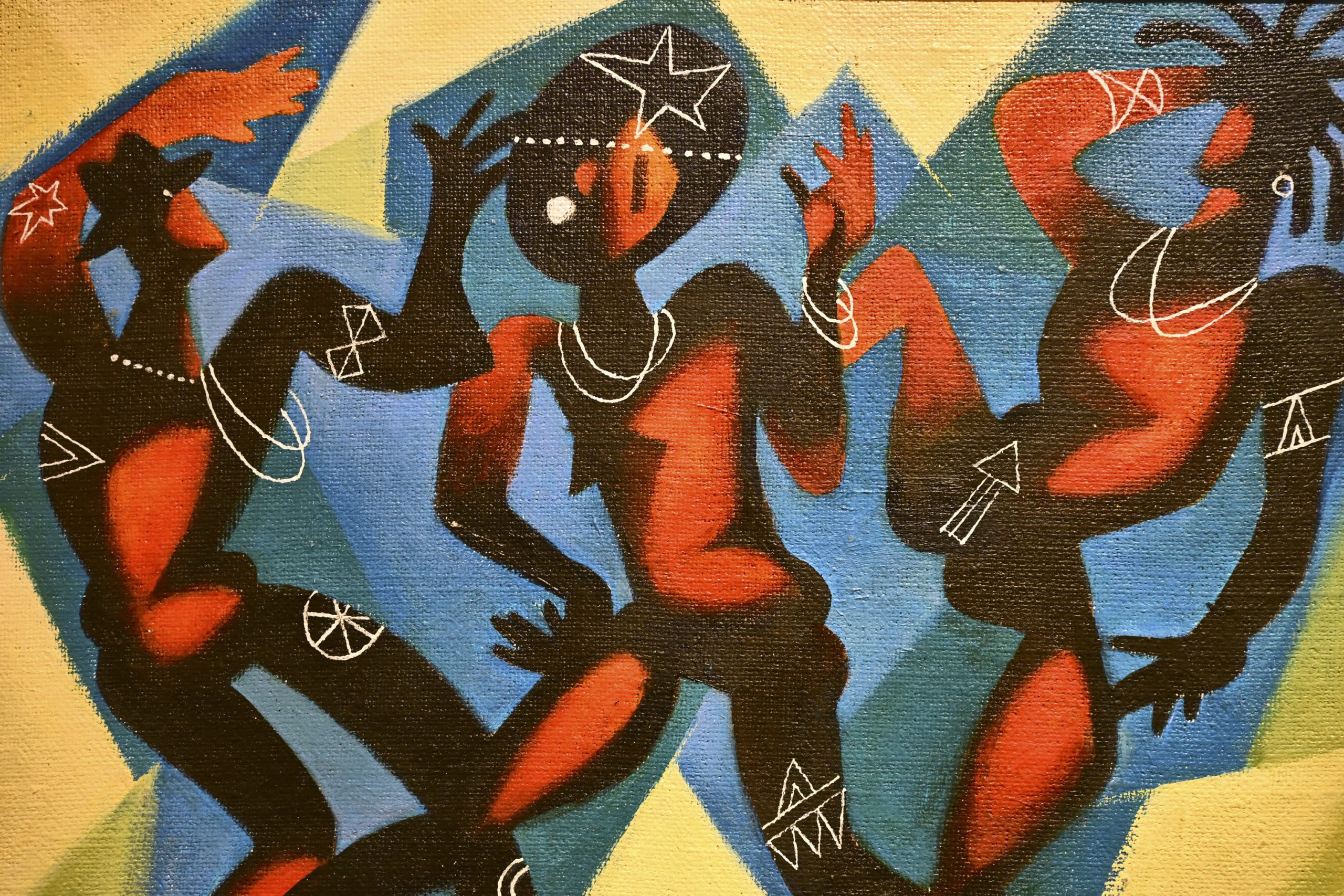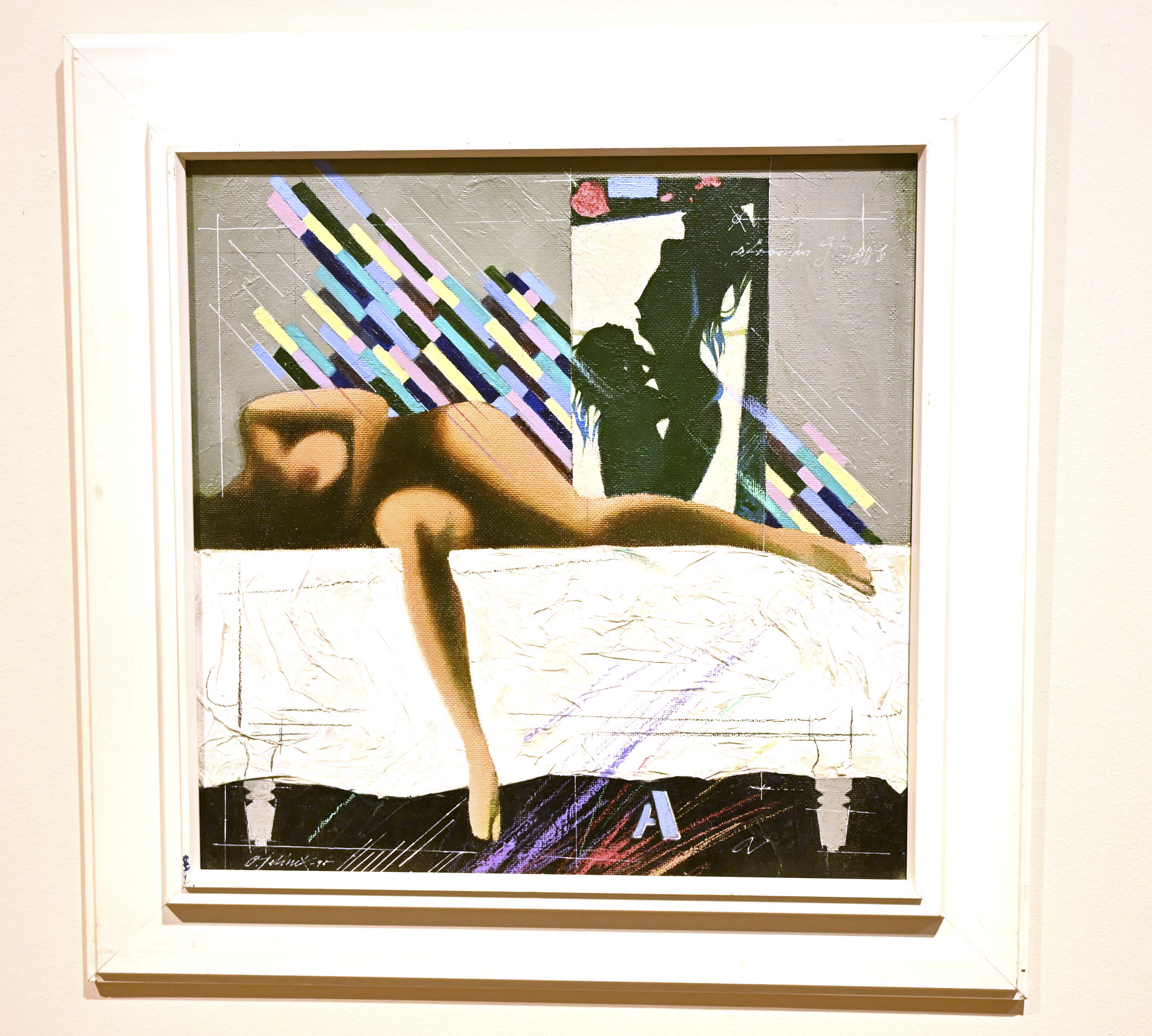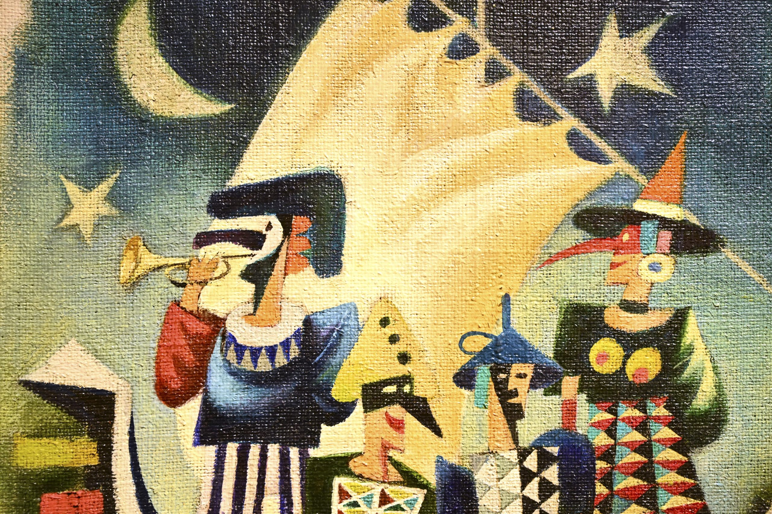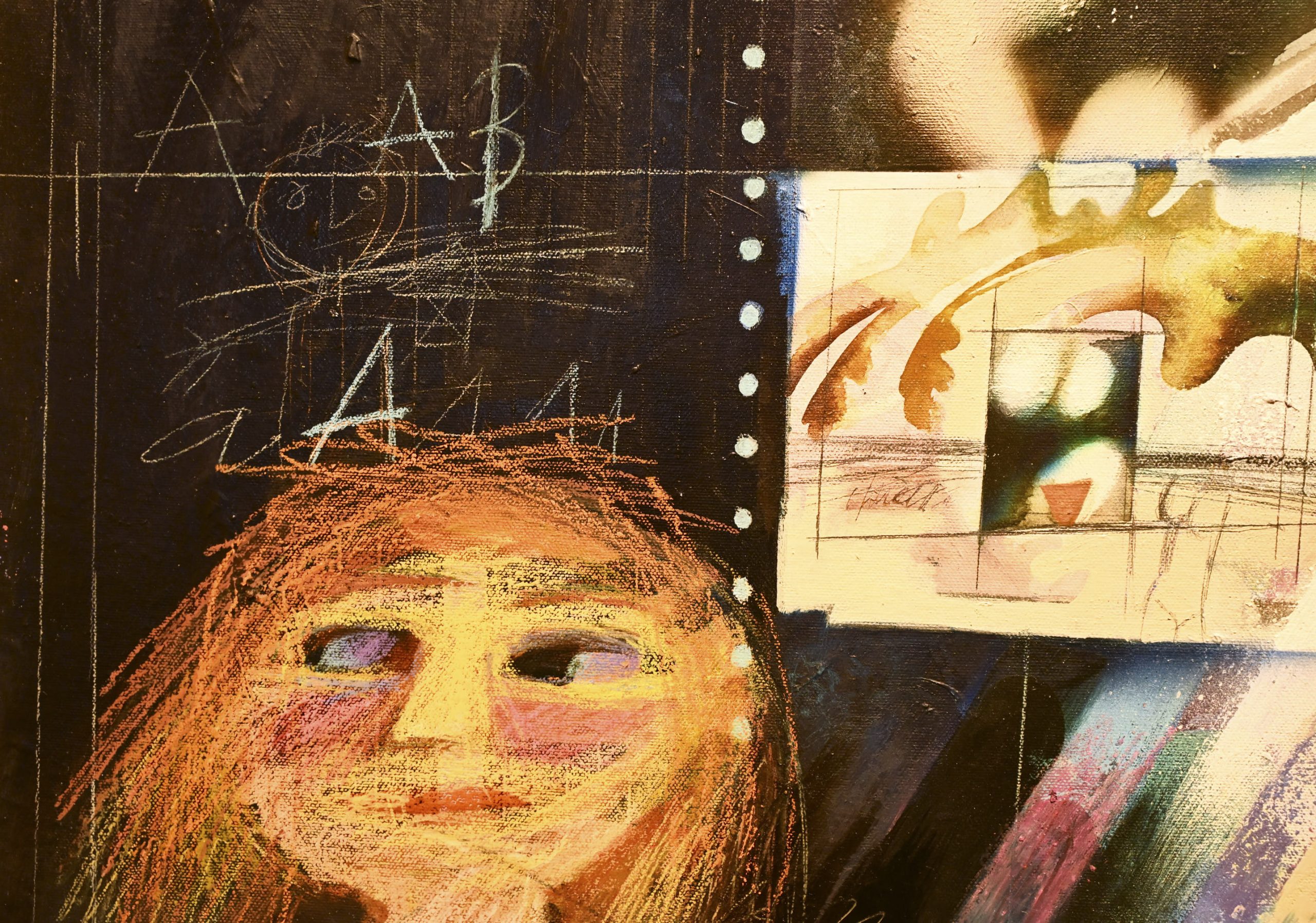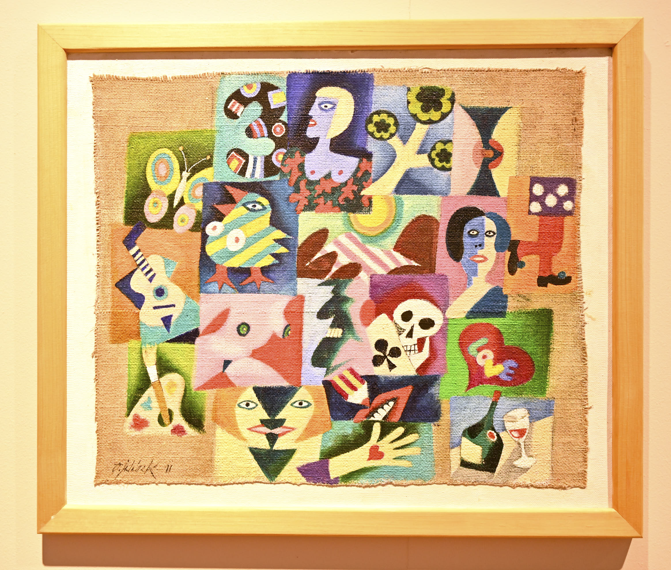 Na mostecké výstavě uvidíme hlavně malby. Jsou suverénní. Většina se vyznačuje hravostí a výraznou barevností, několik kousků je ale o poznání temnějších a barevná škála je spíš černošedá než jakákoli jiná.